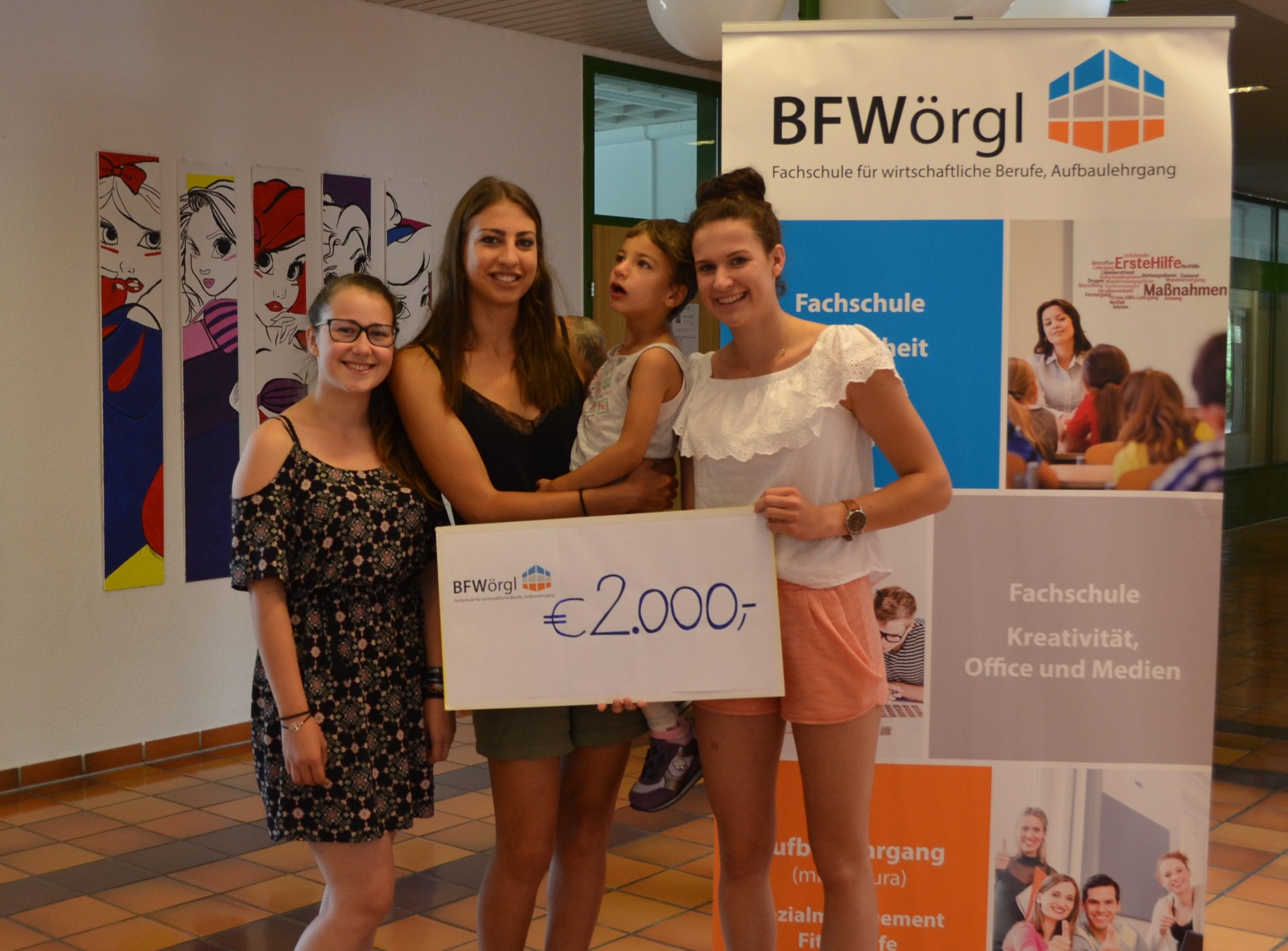 Wir lernen nicht nur aus Büchern, sondern auch aus dem Herzen!! Das haben die SchülerInnen der BFW Wörgl vorgelebt und sich seit September 2017 mit allen Projekten in den Dienst einer regionalen “ guten Sache“ gestellt! Stolze Euro 2.000,00 haben sie mit ihren Projekten während des vergangenen Schuljahres „erarbeitet“ und damit einer jungen, notleidenden Mutter eine dringende Soforthilfe ermöglicht! Schule die Verantwortung lebt! Oben im Bild zu sehen sind die beiden Schülerinnen, die den Anstoß zu diesem Projekt gaben und Adrijana mit ihrer Mutter.