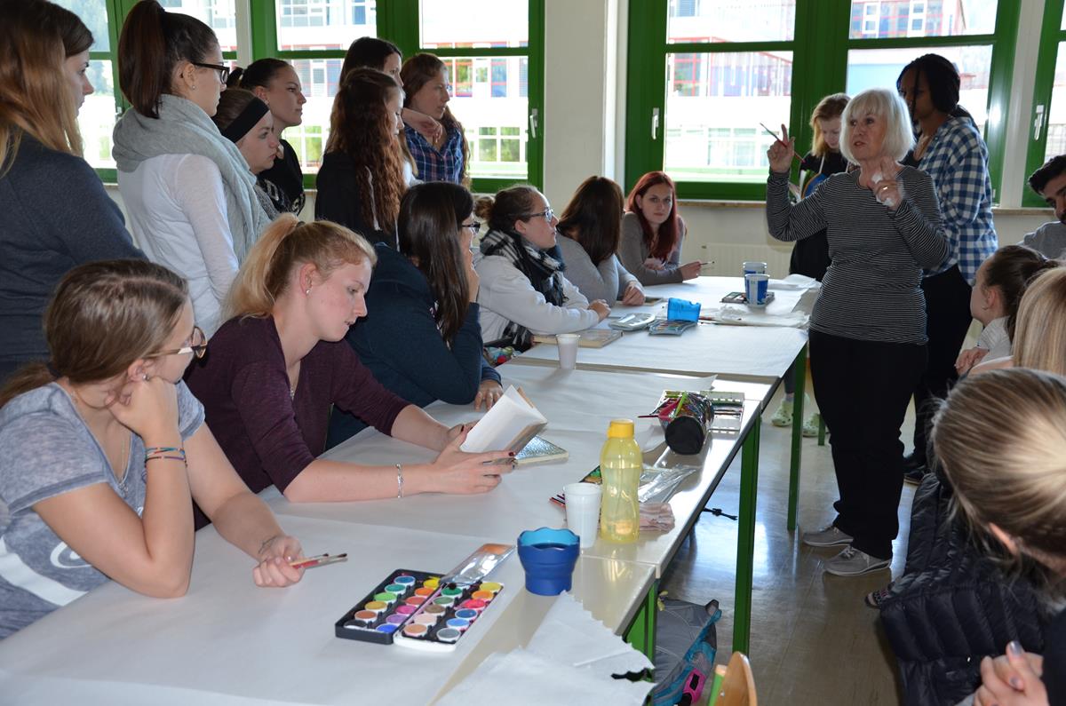 Am 2. Mai 2017 besuchte die Tiroler Künstlerin Gabriele Brüchert die 2. Klasse des Aufbaulehrgangs im Unterrichtfach MUBEKA bei Dipl.-Päd. Petronella Rieder, BEd. an der Bundesfachschule für wirtschaftliche Berufe mit Aufbaulehrgang in Wörgl. Zu Beginn erzählte Frau Brüchert über ihre bisherige künstlerische Laufbahn, anschließend zeigte sie einige Werke der wichtigsten Aquarellisten, wie zum Beispiel Dürer, Turner, Monet oder Schiestl. Frau Gabriela Brüchert erklärte anschaulich worauf beim Aquarellieren zu achten ist. Am vorgegebenen Thema „Fische“ arbeiteten die SchülerInnen eifrig und wurden von der Künstlerin tatkräftig unterstützt und es kamen interessante und außergewöhnliche Werke zum Vorschein. Der Nachmittag war in den Augen aller ein voller Erfolg und die SchülerInnen freuen sich, in Zukunft wieder KünstlerInnen im Unterricht begrüßen zu dürfen.