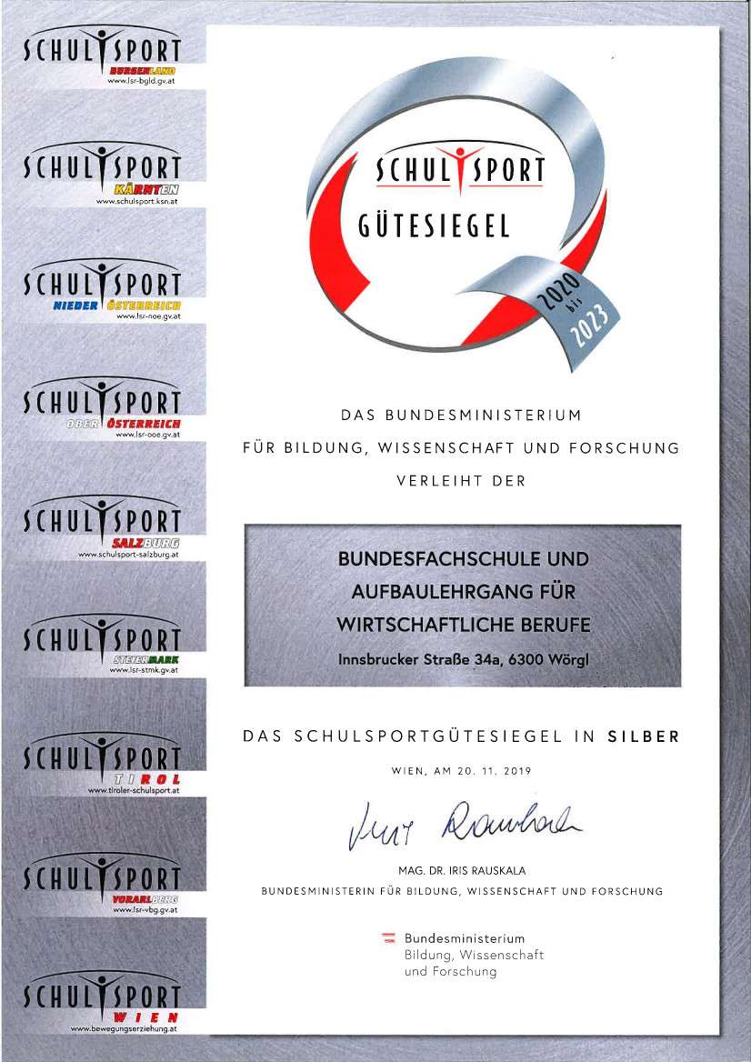 Wir haben es wieder geschafft! Stolz dürfen wir bekannt geben, dass wir erneut Träger des Sportgütesiegels sind. Die Kommission hat uns mit SILBER ausgezeichnet! Damit trotzen wir der situationsbedingten Sportruhephase an unserer Schule und hoffen, dass wir ab Herbst wieder voller Elan durchstarten können.