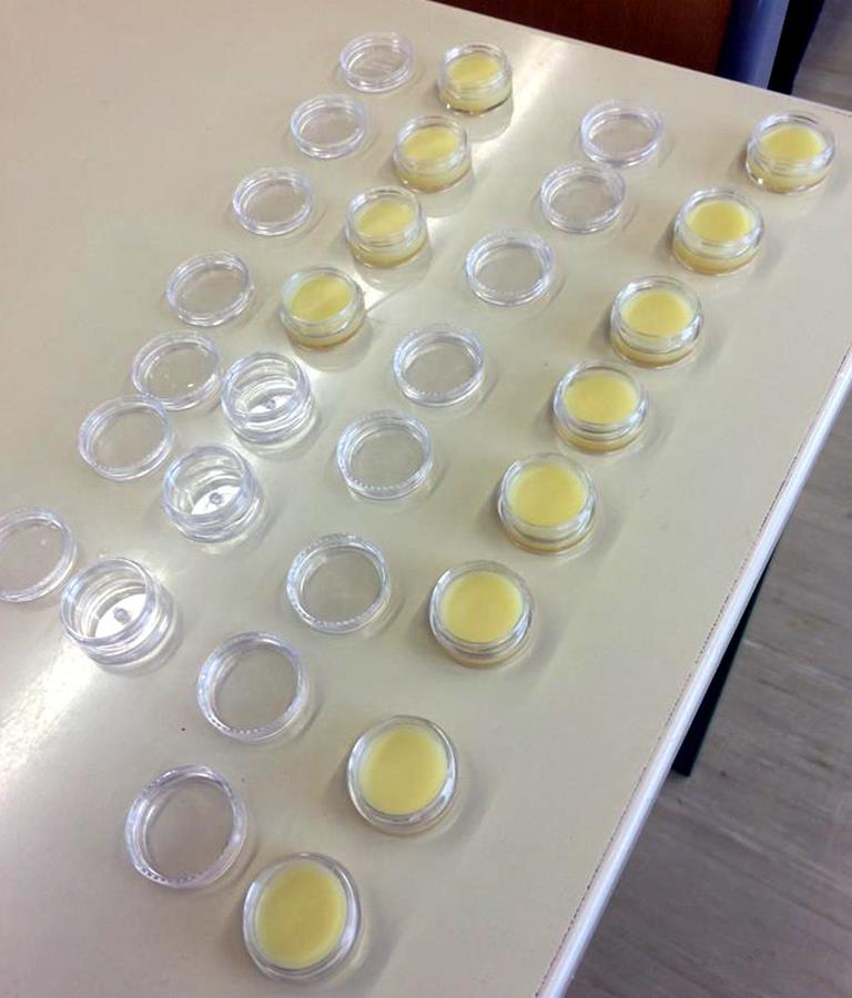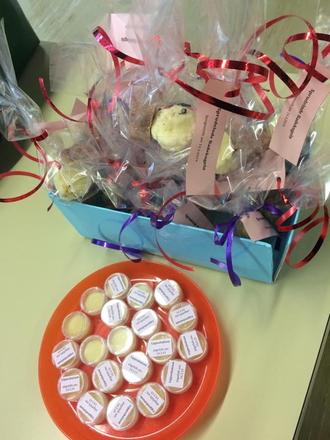 Wir haben eine leichte, nach Orange oder Vanille duftende Handcreme, einen Ringelblüten-Lippenbalsam und sprudelnde-glitzernde Badekugeln produziert.