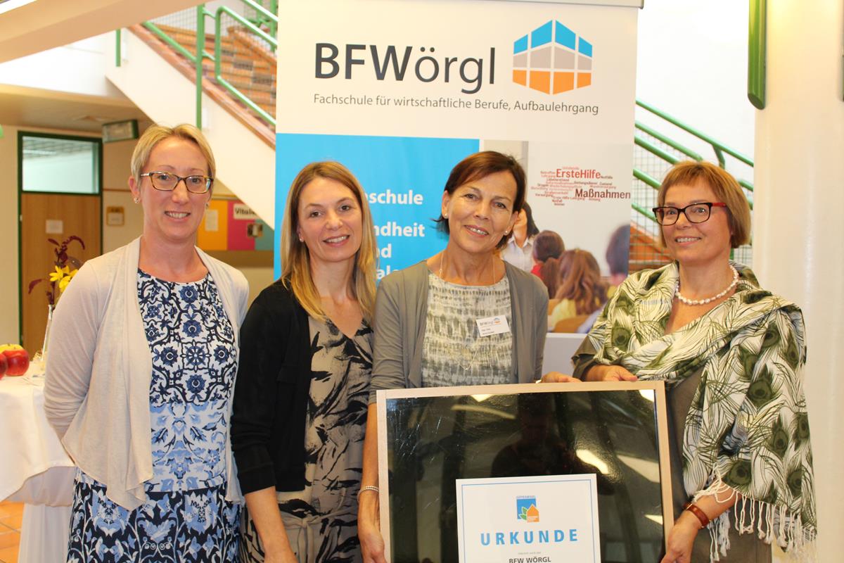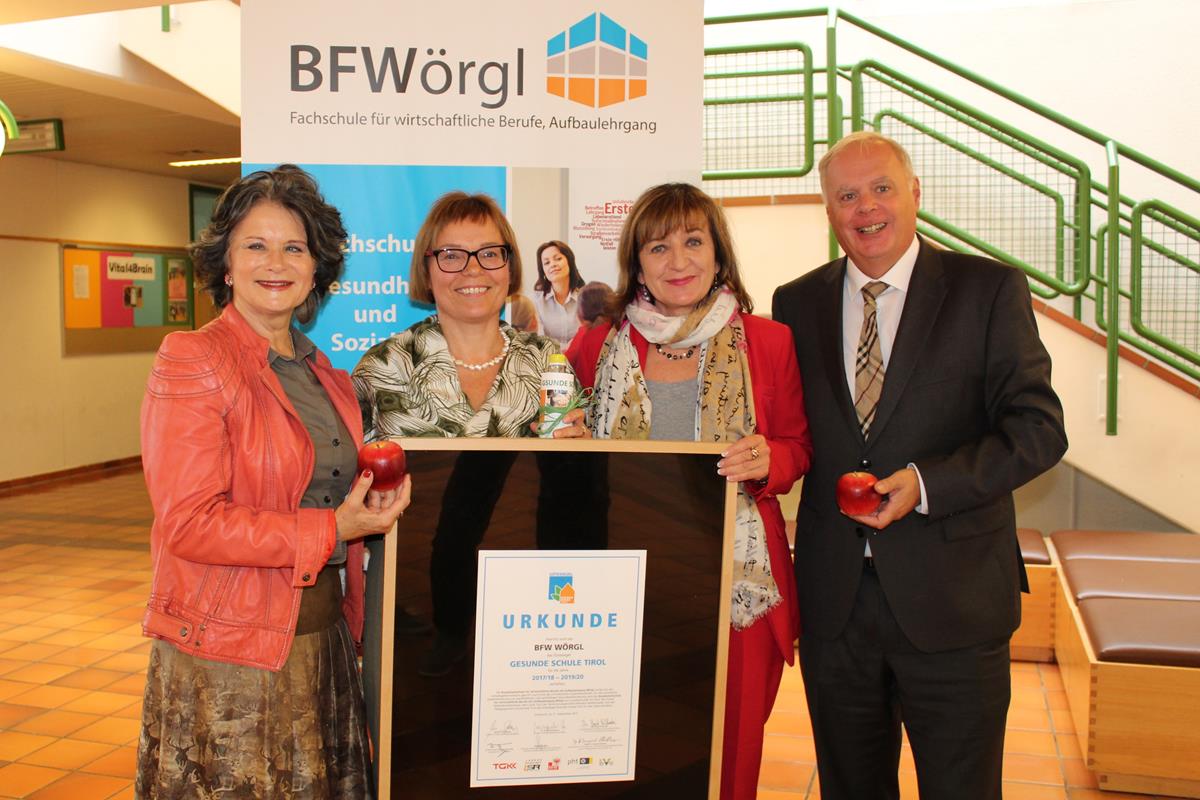 Das Tiroler Gütesiegel wurde von Landesschulratspräsidentin und Bildungslandesrätin Beate Palfrader, TGKK-Obmann Werner Salzburger und Bürgermeisterin Hedi Wechner an die Direktorin Helga Dobler-Fuchs und den Projektleiterinnen Christiane Schneider, Anni Gruber und Alexandra Kistl überreicht.